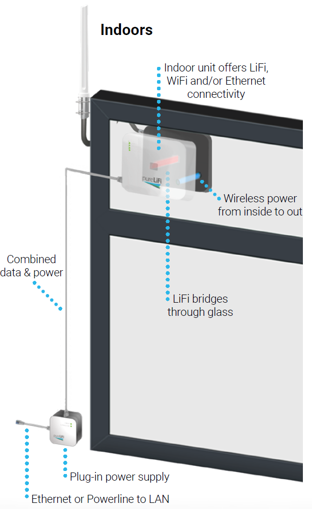 • 室内側はイーサネットまたはオプションでLiFi/WiFi/その他で屋内接続