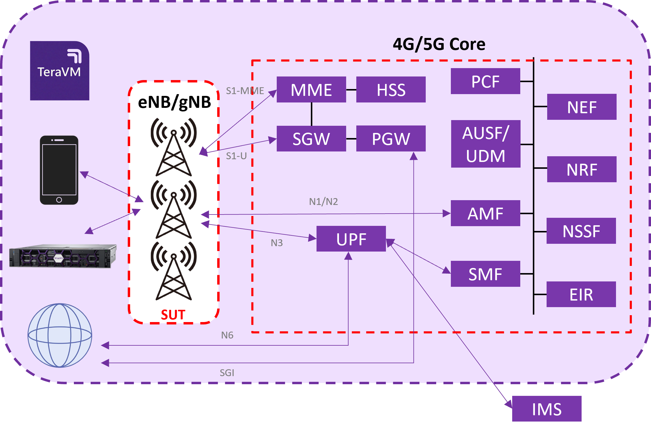 4G/5G端末+基地局、各種モバイルコアノードを擬似することが可能です。各種制御系/データ系の通信を行うことで各コアノードの機能評価、さらには端末数や通信量を増加させての性能評価を実現できます。