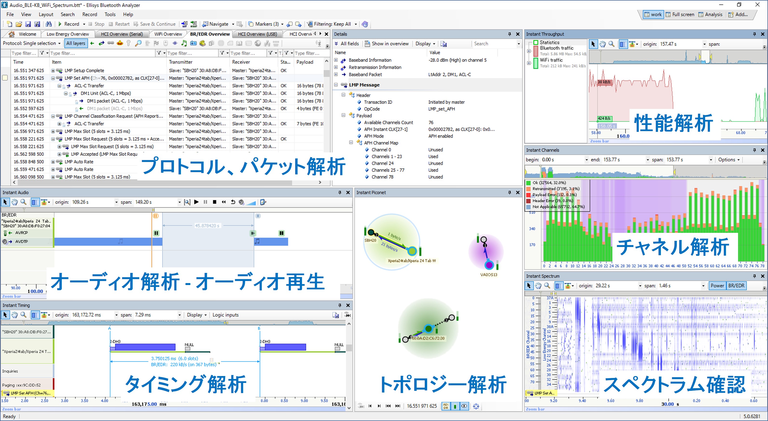パケットの自動的なグルーピング、解りやすい詳細情報だけでなく、チャネルごとのパケット数やエラー、再送数、スループットも任意の時間で簡単に確認できます。また、オーディオの再生も可能で、音声問題の解析にも多大な貢献をします。
