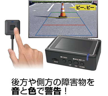 AIを活用することで、人や自転車、バイクなどの障害物を検知して、ドライバーへお知らせします。弊社「HD CAR VIEW SYSTEM」との組合せで装置型式指定対象車両においても取付が可能となりました。後方映像の記録や、後方の障害物を色と音で警告ができ、ドライバーの安全運転をサポートします。