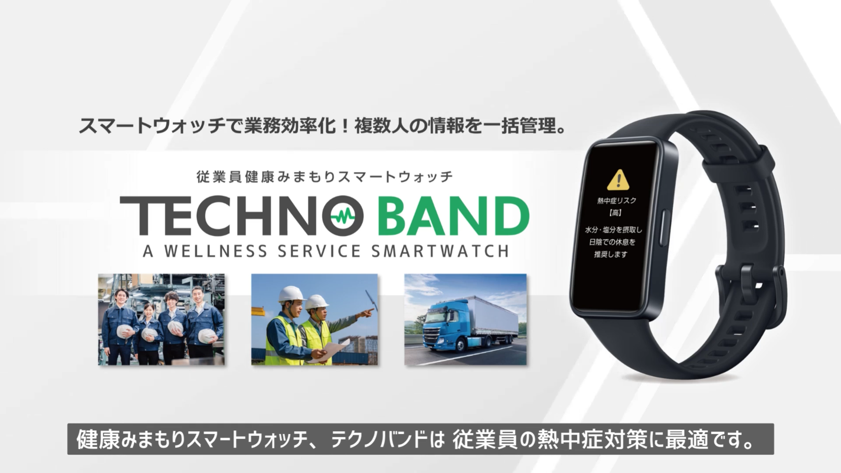 テクノバンドは、建設や工場など現場で働く方の健康と安全を見守るスマートウオッチ型のウェアラブルです。夏場の熱中症対策、危険な現場作業、夜間や休日の一人作業などにおいて、従業員の安否をパソコン、スマホ、テクノバンドで確認ができます。 また、熱中症リスクアラートやSOS救助要請は、同じ現場の作業者間でのアラート共有(バディ機能)で迅速な救助活動を支援します。現場で働く方の見守り機能が充実しています。